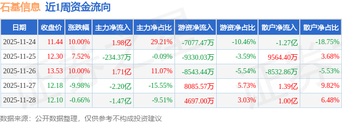 资金流向数据方面,本周石基信息主力资金合计净流出82.04万元,游资资金合计净流出1.22亿元,散户资金合计净流入1.23亿元。本周资金流向一览见下表: