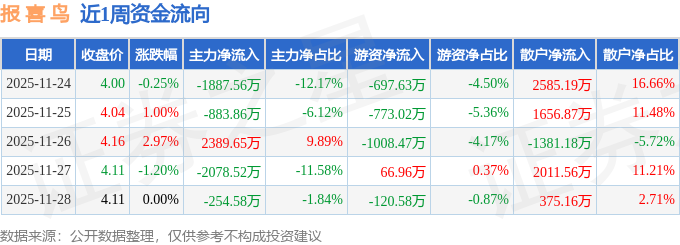 证券之星消息,截至2025年11月28日收盘,报 喜 鸟(002154)报收于4.11元,较上周的4.01元上涨2.49%。本周,报 喜 鸟11月27日盘中最高价报4.23元。11月24日盘中最低价报3.95元。报 喜 鸟当前最新总市值59.98亿元,在服装家纺板块市值排名17/59,在两市A股市值排名2873/5168。