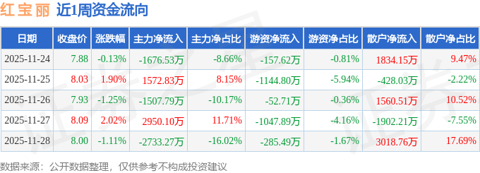 资金流向数据方面,本周红 宝 丽主力资金合计净流出1394.67万元,游资资金合计净流出2688.51万元,散户资金合计净流入4083.17万元。本周资金流向一览见下表: