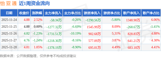 资金流向数据方面,本周怡 亚 通主力资金合计净流出5663.66万元,游资资金合计净流入2430.21万元,散户资金合计净流入3233.45万元。本周资金流向一览见下表: