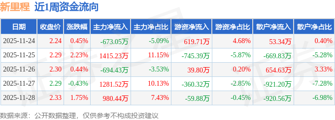 资金流向数据方面,本周新里程主力资金合计净流入2309.71万元,游资资金合计净流出506.08万元,散户资金合计净流出1803.62万元。本周资金流向一览见下表: