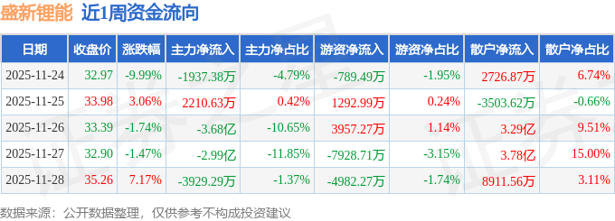 资金流向数据方面,本周盛新锂能主力资金合计净流出7.03亿元,游资资金合计净流出8450.2万元,散户资金合计净流入7.88亿元。本周资金流向一览见下表: