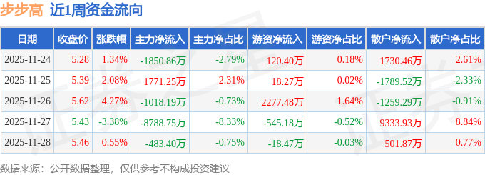 资金流向数据方面,本周步步高主力资金合计净流出1.04亿元,游资资金合计净流入1852.5万元,散户资金合计净流入8517.45万元。本周资金流向一览见下表:
