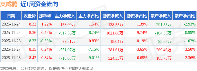 资金流向数据方面,本周英威腾主力资金合计净流出1947.84万元,游资资金合计净流入1984.41万元,散户资金合计净流出36.57万元。本周资金流向一览见下表:
