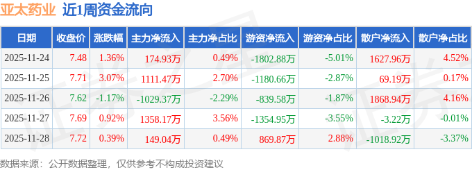 资金流向数据方面,本周亚太药业主力资金合计净流入1764.25万元,游资资金合计净流出4308.2万元,散户资金合计净流入2543.95万元。本周资金流向一览见下表: