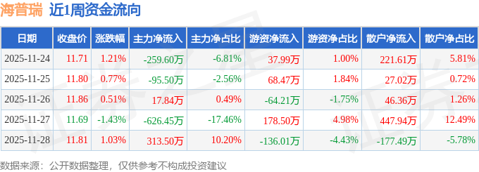 资金流向数据方面,本周海普瑞主力资金合计净流出650.2万元,游资资金合计净流入84.76万元,散户资金合计净流入565.45万元。本周资金流向一览见下表: