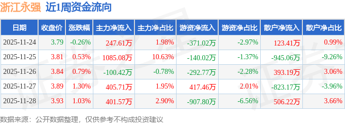 资金流向数据方面,本周浙江永强主力资金合计净流入2039.55万元,游资资金合计净流出1294.15万元,散户资金合计净流出745.4万元。本周资金流向一览见下表: