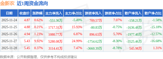 资金流向数据方面,本周金新农主力资金合计净流入1.06亿元,游资资金合计净流出3889.64万元,散户资金合计净流出6751.57万元。本周资金流向一览见下表: