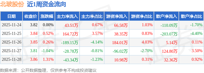 资金流向数据方面,本周北玻股份主力资金合计净流出53.04万元,游资资金合计净流入203.9万元,散户资金合计净流出150.87万元。本周资金流向一览见下表: