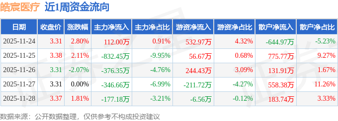 资金流向数据方面,本周皓宸医疗主力资金合计净流出1620.64万元,游资资金合计净流入615.8万元,散户资金合计净流入1004.84万元。本周资金流向一览见下表: