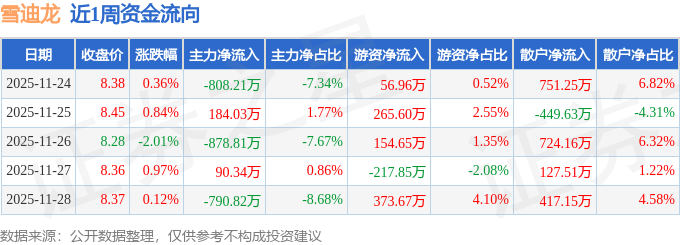 沪深股通持股方面,截止2025年11月28日收盘,雪迪龙深股通持股数为497.01万股,占流通股比为139.0%。