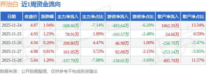 资金流向数据方面,本周乔治白主力资金合计净流出456.67万元,游资资金合计净流出616.15万元,散户资金合计净流入1072.82万元。本周资金流向一览见下表: