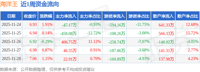 资金流向数据方面,本周海洋王主力资金合计净流出29.03万元,游资资金合计净流出1309.9万元,散户资金合计净流入1338.94万元。本周资金流向一览见下表: