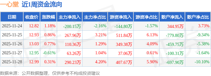 资金流向数据方面,本周一心堂主力资金合计净流入531.67万元,游资资金合计净流入1161.14万元,散户资金合计净流出1692.82万元。本周资金流向一览见下表: