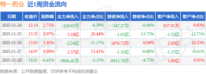 资金流向数据方面,本周特一药业主力资金合计净流入2.52亿元,游资资金合计净流出3.7亿元,散户资金合计净流入1.18亿元。本周资金流向一览见下表:
