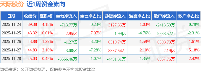 沪深股通持股方面,截止2025年11月28日收盘,天际股份深股通持股数为197.43万股,占流通股比为39.0%。