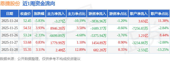 沪深股通持股方面,截止2025年11月28日收盘,恩捷股份深股通持股数为3276.63万股,占流通股比为398.0%。