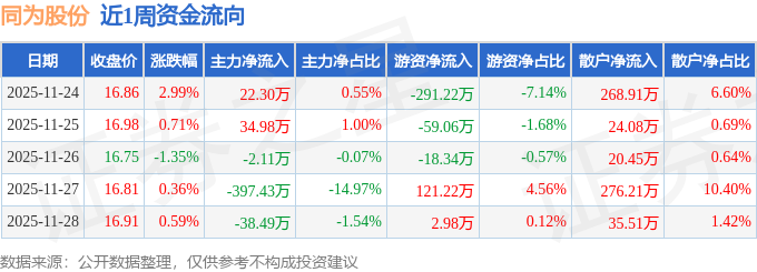 资金流向数据方面,本周同为股份主力资金合计净流出380.74万元,游资资金合计净流出244.42万元,散户资金合计净流入625.17万元。本周资金流向一览见下表: