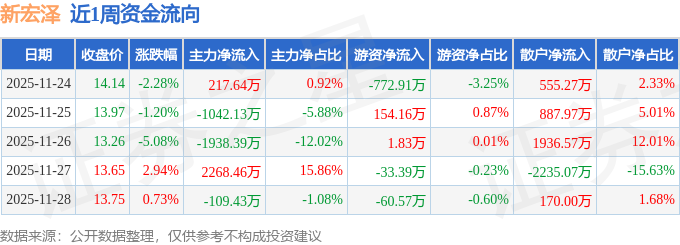 资金流向数据方面,本周新宏泽主力资金合计净流出603.85万元,游资资金合计净流出710.89万元,散户资金合计净流入1314.75万元。本周资金流向一览见下表: