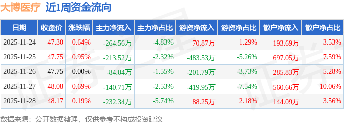 资金流向数据方面,本周大博医疗主力资金合计净流出935.17万元,游资资金合计净流出946.14万元,散户资金合计净流入1881.31万元。本周资金流向一览见下表:
