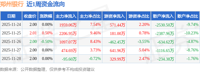 资金流向数据方面,本周郑州银行主力资金合计净流入5642.18万元,游资资金合计净流入1261.93万元,散户资金合计净流出6904.11万元。本周资金流向一览见下表: