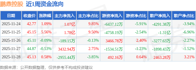 资金流向数据方面,本周鹏鼎控股主力资金合计净流入2.88亿元,游资资金合计净流出8770.88万元,散户资金合计净流出2.01亿元。本周资金流向一览见下表: