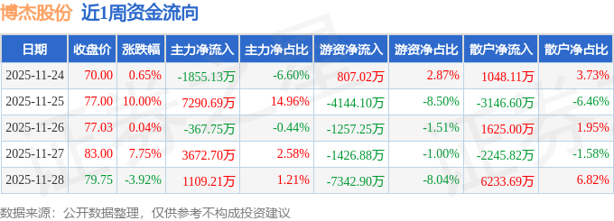 资金流向数据方面,本周博杰股份主力资金合计净流入9849.72万元,游资资金合计净流出1.34亿元,散户资金合计净流入3514.38万元。本周资金流向一览见下表: