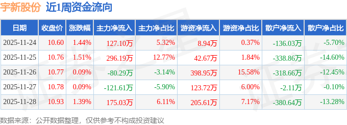 资金流向数据方面,本周宇新股份主力资金合计净流入396.43万元,游资资金合计净流入779.89万元,散户资金合计净流出1176.31万元。本周资金流向一览见下表: