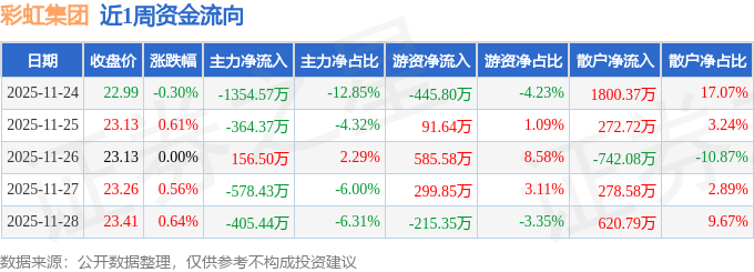 资金流向数据方面,本周彩虹集团主力资金合计净流出2546.3万元,游资资金合计净流入315.92万元,散户资金合计净流入2230.39万元。本周资金流向一览见下表: