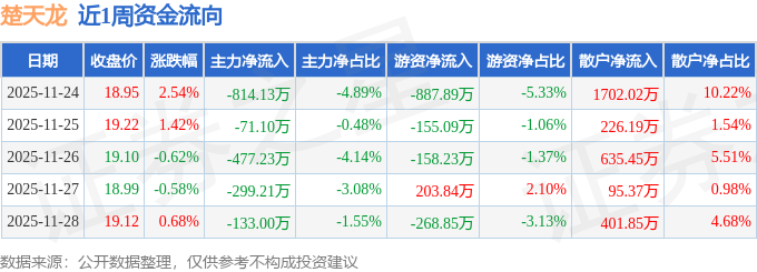 资金流向数据方面,本周楚天龙主力资金合计净流出1794.67万元,游资资金合计净流出1266.21万元,散户资金合计净流入3060.88万元。本周资金流向一览见下表: