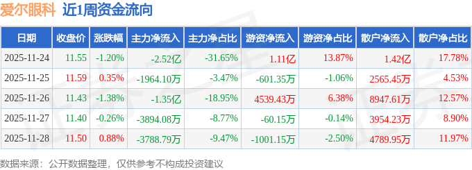 证券之星消息,截至2025年11月28日收盘,爱尔眼科(300015)报收于11.5元,较上周的11.69元下跌1.63%。本周,爱尔眼科11月24日盘中最高价报11.79元。11月27日盘中最低价报11.31元,股价触及近一年最低点。爱尔眼科当前最新总市值1072.42亿元,在医疗服务板块市值排名2/50,在两市A股市值排名158/5168。