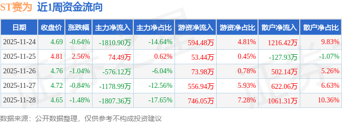 资金流向数据方面,本周ST赛为主力资金合计净流出5298.88万元,游资资金合计净流入2024.88万元,散户资金合计净流入3274.01万元。本周资金流向一览见下表: