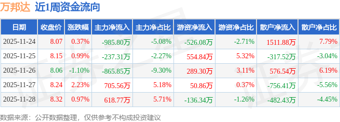 资金流向数据方面,本周万邦达主力资金合计净流出764.63万元,游资资金合计净流入232.58万元,散户资金合计净流入532.06万元。本周资金流向一览见下表: