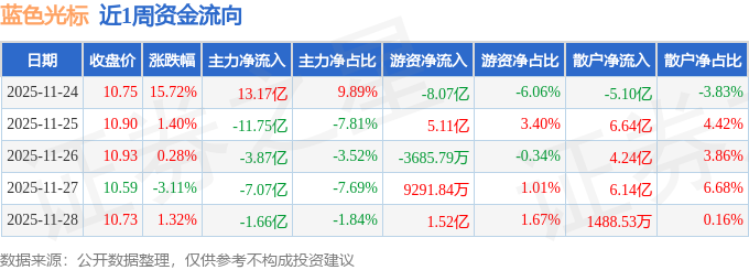 资金流向数据方面,本周蓝色光标主力资金合计净流出11.19亿元,游资资金合计净流出8825.52万元,散户资金合计净流入12.07亿元。本周资金流向一览见下表: