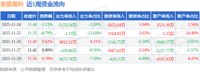 资金流向数据方面,本周荃银高科主力资金合计净流出2.02亿元,游资资金合计净流入5913.58万元,散户资金合计净流入1.43亿元。本周资金流向一览见下表: