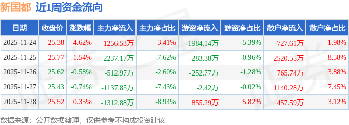 资金流向数据方面,本周新国都主力资金合计净流出3944.35万元,游资资金合计净流出1667.42万元,散户资金合计净流入5611.76万元。本周资金流向一览见下表: