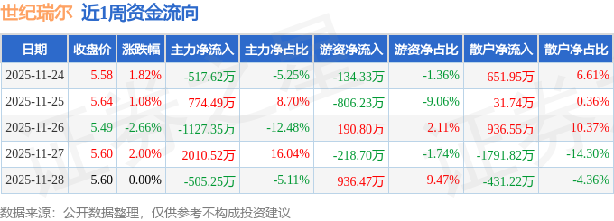 资金流向数据方面,本周世纪瑞尔主力资金合计净流入634.79万元,游资资金合计净流出32.0万元,散户资金合计净流出602.79万元。本周资金流向一览见下表: