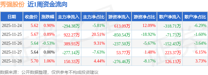资金流向数据方面,本周秀强股份主力资金合计净流入891.0万元,游资资金合计净流出697.64万元,散户资金合计净流出193.36万元。本周资金流向一览见下表: