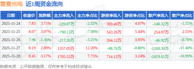资金流向数据方面,本周雷曼光电主力资金合计净流入1818.18万元,游资资金合计净流入1802.14万元,散户资金合计净流出3620.32万元。本周资金流向一览见下表: