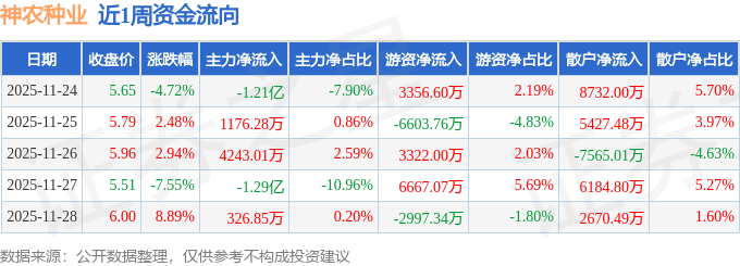 资金流向数据方面,本周神农种业主力资金合计净流出1.92亿元,游资资金合计净流入3744.56万元,散户资金合计净流入1.54亿元。本周资金流向一览见下表: