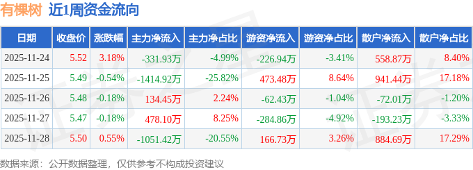 资金流向数据方面,本周有棵树主力资金合计净流出2185.73万元,游资资金合计净流入65.97万元,散户资金合计净流入2119.76万元。本周资金流向一览见下表: