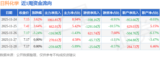 资金流向数据方面,本周日科化学主力资金合计净流入1617.78万元,游资资金合计净流出868.23万元,散户资金合计净流出749.55万元。本周资金流向一览见下表: