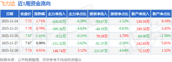 资金流向数据方面,本周飞力达主力资金合计净流出752.38万元,游资资金合计净流出373.72万元,散户资金合计净流入1126.1万元。本周资金流向一览见下表: