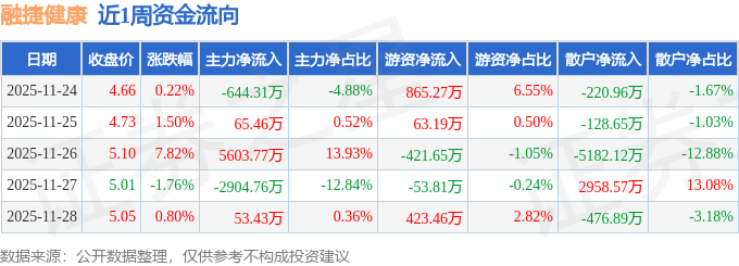 资金流向数据方面,本周融捷健康主力资金合计净流入2173.59万元,游资资金合计净流入876.46万元,散户资金合计净流出3050.05万元。本周资金流向一览见下表: