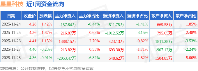 资金流向数据方面,本周星星科技主力资金合计净流出392.46万元,游资资金合计净流入140.78万元,散户资金合计净流入251.68万元。本周资金流向一览见下表: