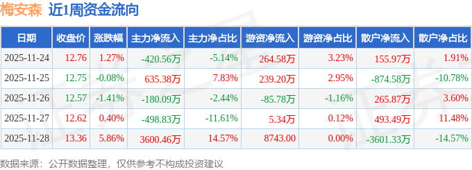 资金流向数据方面,本周梅安森主力资金合计净流入3136.36万元,游资资金合计净流入424.21万元,散户资金合计净流出3560.58万元。本周资金流向一览见下表: