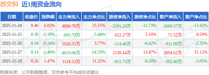 资金流向数据方面,本周苏交科主力资金合计净流入1708.8万元,游资资金合计净流出50.68万元,散户资金合计净流出1658.12万元。本周资金流向一览见下表: