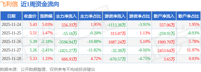 资金流向数据方面,本周飞利信主力资金合计净流出4850.11万元,游资资金合计净流入185.97万元,散户资金合计净流入4664.14万元。本周资金流向一览见下表: