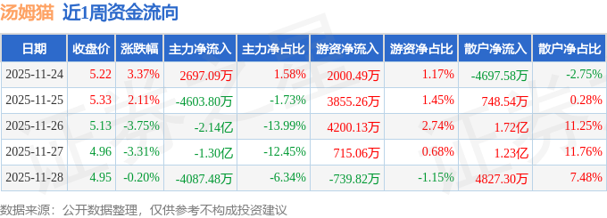 资金流向数据方面,本周汤姆猫主力资金合计净流出4.04亿元,游资资金合计净流入1.0亿元,散户资金合计净流入3.04亿元。本周资金流向一览见下表: