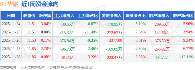资金流向数据方面,本周ST华铭主力资金合计净流出838.19万元,游资资金合计净流入148.44万元,散户资金合计净流入689.75万元。本周资金流向一览见下表: